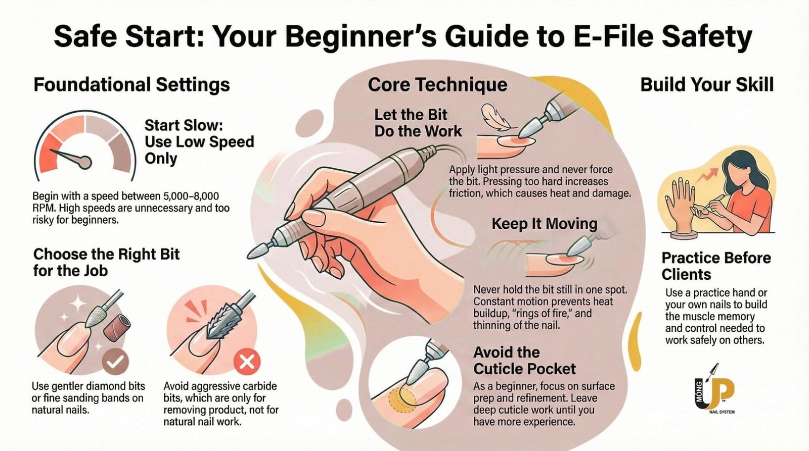 An e-file can make nail prep, refinement, and removal faster and cleaner, but misuse can cause damage. For beginners, control and safety are key.