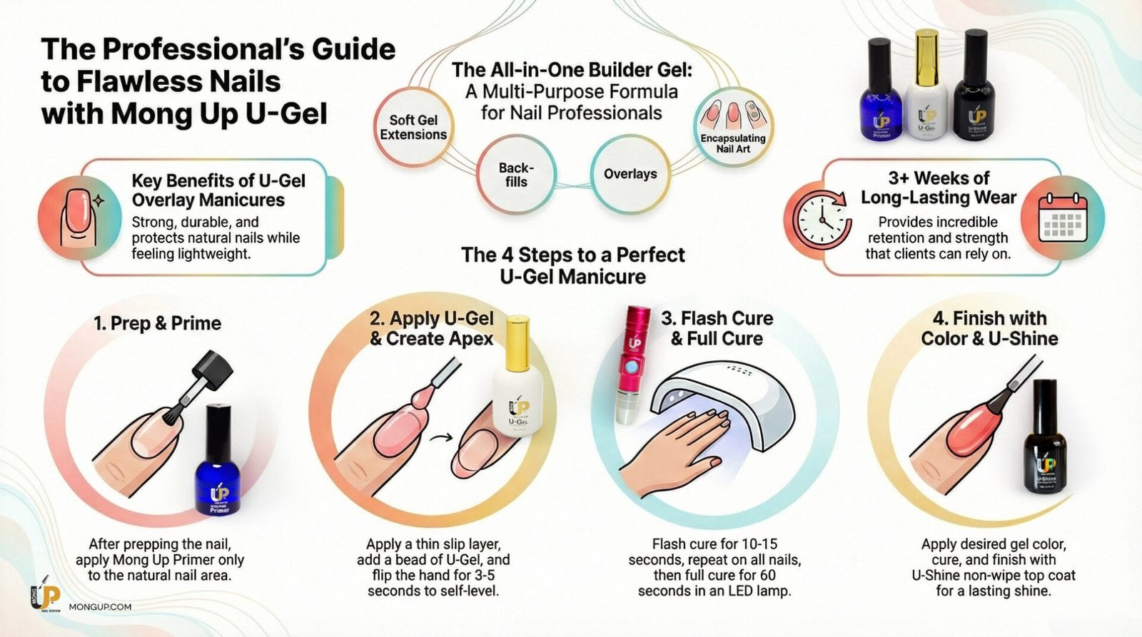 U-Gel is a special formula builder and extension gel used for gel overlays, soft gel tip extensions, backfills, rebalancing, and strengthening natural nails. It works as both a builder gel and an adhesive for soft gel tips within the Móng Úp Nail System.