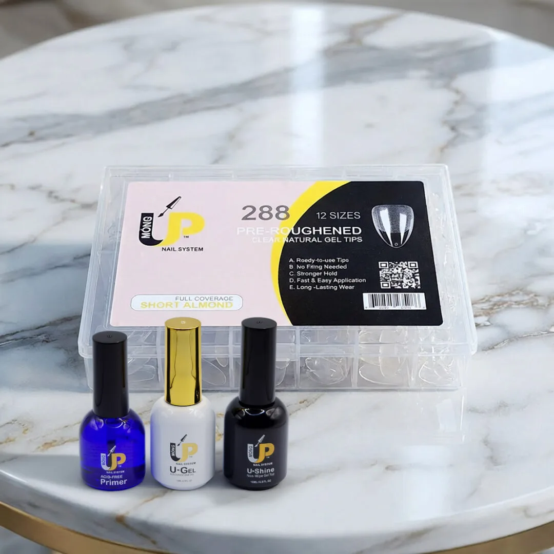 The ultimate “All-in-One” solution for beautiful, long-lasting extensions. This professional-grade kit combines our best-selling Short Square Pre-Roughened Tips with the essential Mong Up Trio (Primer, U-Gel, and U-Shine). Designed to cut your service time in half without compromising on a 4-week+ wear.